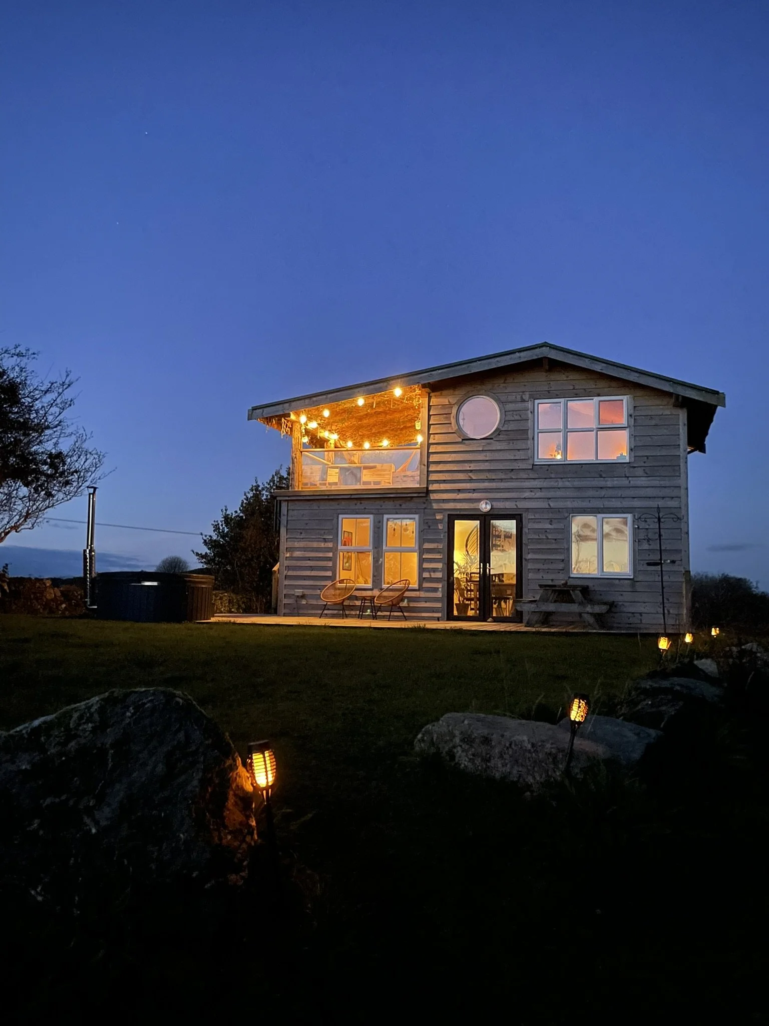 The Éalú Escape chalet, Westport,  at dusk with warm interior lights, string lights on the upper porch, and landscape lighting along the pathway. The house has multiple large windows and a sliding glass door leading to the patio.